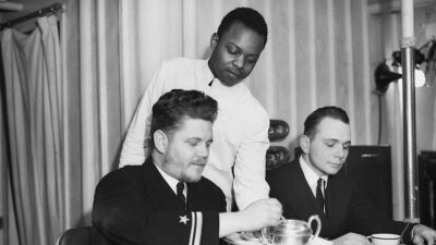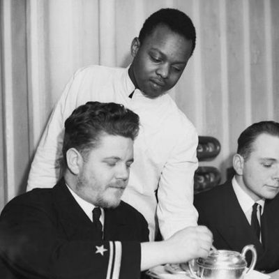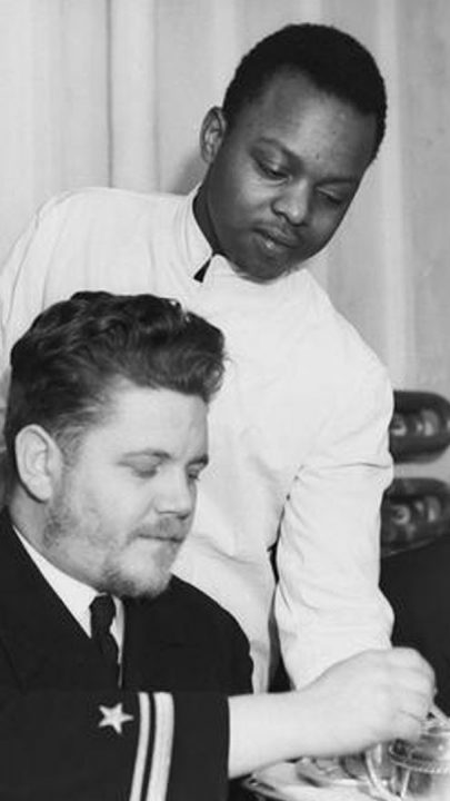 Imperial War Museum Photo: A 9196 (Part of the Admiralty Official Collection). Black stewards serving in the ward room on a US destroyer, one of the first which arrived at the Londonderry naval base in January 1942 after escorting a convoy across the Atlantic. Copyright Lieutenant HW Tomlin – Royal Navy Photographer.